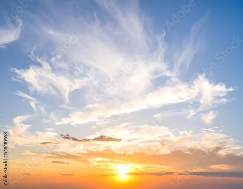 Sunset behind high-altitude clouds with blue sky and warm orange light, realistic AI-generated sky landscape