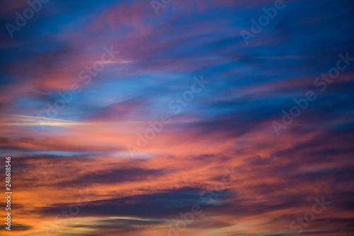 Sunset sky with clouds. Golden sunlight for your idea of web header. Cloudy landscape for background in serenity colors - blue, violet, yellow and pink tone.