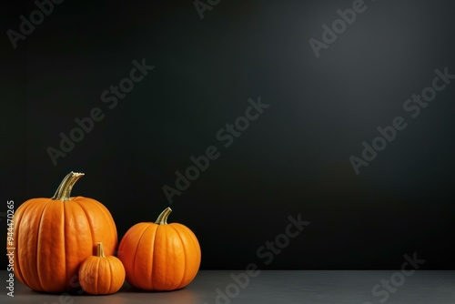 Three vibrant pumpkins on a dark background with ample copy space, ideal for seasonal themes.
