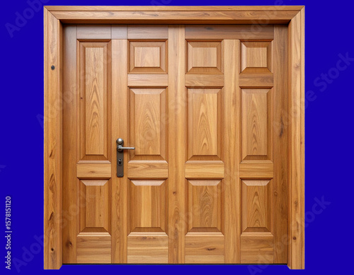 Traditional Oak Wooden Door with Six Rectangular Panels, Front View on White Background