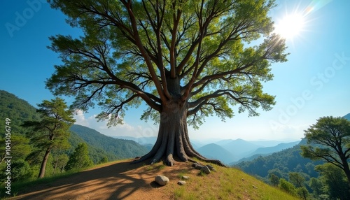 Tranquil Vista A tree stands tall on a mountain ridge basking in the sun