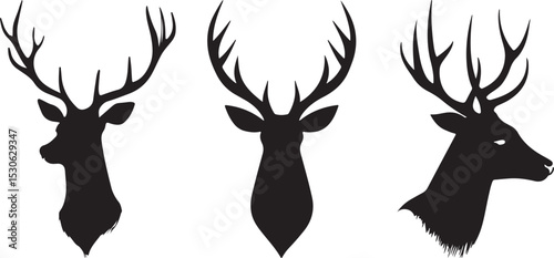 Trio of Deer Head Silhouettes with Antlers in Front and Side Views for Vector Wildlife Icons