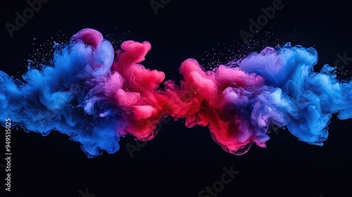 Two colorful clouds of smoke, red and blue, collide dramatically against a dark background, creating an intense and visually striking abstract composition.