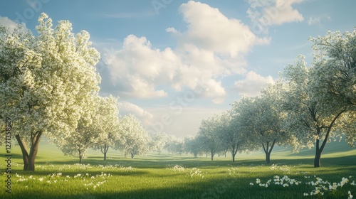 Vast Meadow Lined with Trees Beginning to Bloom, Soft Green Buds Shimmering in Warm Spring Breeze
