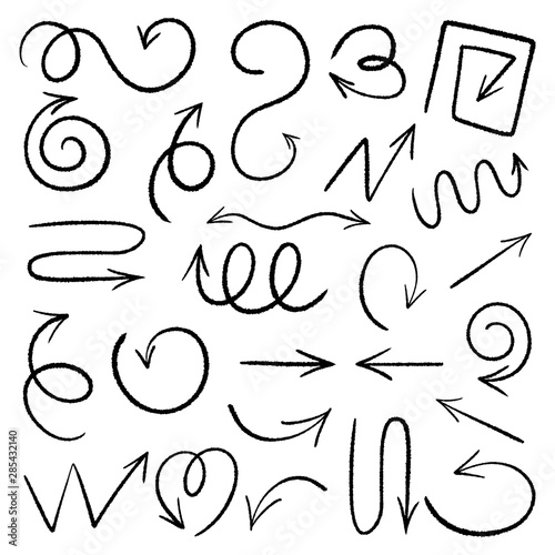 Vector set of arrows in hand drawn style isolated on white background. Abstract different black grunge arrows. Collection of doodle decor elements for design, concept, template, aplication.