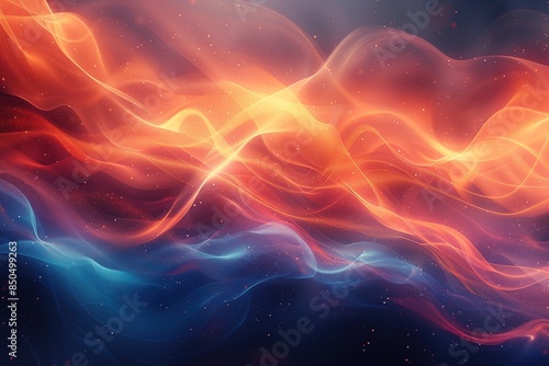 vibrant abstract wave pattern. A gradient of warm reds and oranges transitions into cool blues, a dynamicl phenomenon