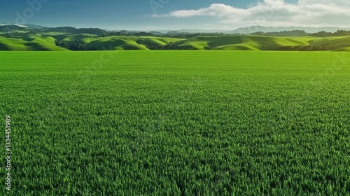 Vibrant lush green grass meadow with soft sunlight, gentle breeze, and a peaceful atmosphere, ideal for backgrounds in nature, relaxation, or environmental themes. The scene features rich green grass