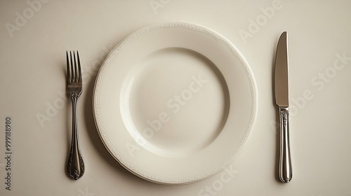 Waiting for our dinner with served plate, fork, and knife in a girl's hands on a white background. A place for text, top view. isolated on white background design