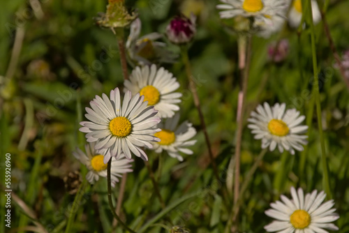 white and yellow daisies in between green grass in a sunny wildflower meadow, selective focus with bokeh background - Bellis perennis