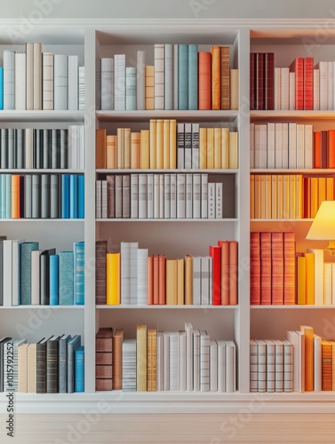 white bookshelf in an office setting showcases a collection of neatly arranged hardcover books and stylish lamps.