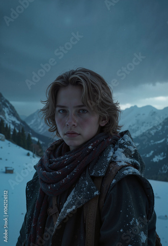 Winter Wanderer in Contemplative Pose Against Majestic Snowy Alps