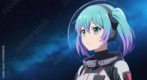 宇宙服を着たアニメの女性が宇宙を背景に考え事をしている, with copy space