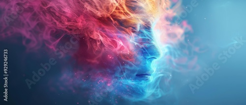 Woman's face with colored smoke emanating from her left side on a dark blue backdrop
