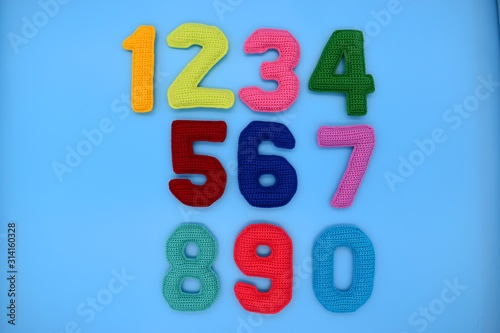1, 2, 3, 4, 5, 6, 7, 8, 9, 0. Multicolored numbers on a blue background are knitted from yarn.