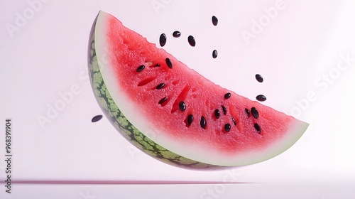 1. **A 3D render of a falling slice of watermelon, its red flesh and black seeds detailed against a pristine white background