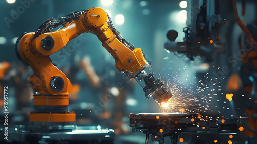 1. Sophisticated robotic arms operate within a high-tech manufacturing facility, performing metal welding tasks.