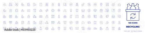 100 Recycling Icons Collection. Thin line icon. Editable stroke. eco, price tag, reusable, garbage bag, shopping bag, recycle, recycling, recyclable, placeholder, recycled bag, recycled