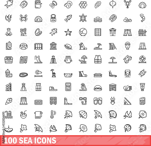 100 sea icons set. Outline illustration of 100 sea icons vector set isolated on white background
