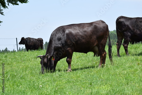 牛の放牧/山形県鶴岡市羽黒町川代にある月山高原牧場で、牛の放牧風景を撮影した写真です。この牧場は、約100haの緑のジュウタンが広がり、雄大な高原の中で牛や羊を眺められます。牛を放牧すると足腰が丈夫になる、広々とした牧場で運動することにより健全な牛になる、管理の手間が省ける、エサ代の削減など良いこと尽くしです。高原からの眺めは最高で、ひそかな観光ポイントになっています。