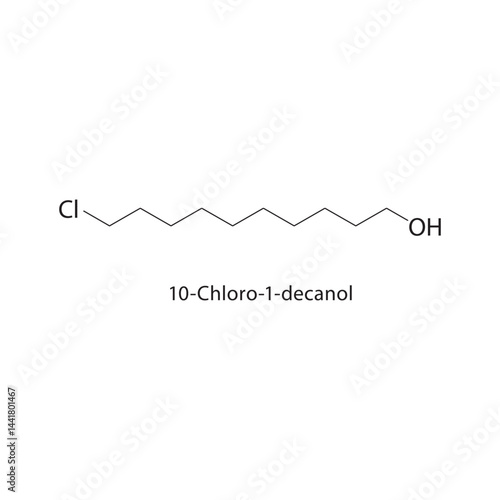 10-Chloro-1-decanol skeletal structure. Chlorinated Alcohol compound schematic illustration. Simple diagram, chemical formula.