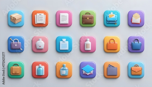 12 Colorful Glossy App Icons Grid – 3D Effect on Light Gray Background. 12 square boxes