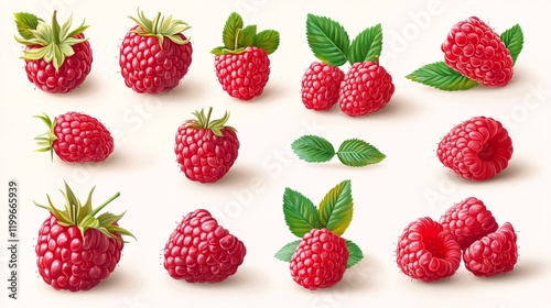 12 realistic raspberry illustrations in different poses: whole, halved, sliced, and with leaves, perfect for vibrant fruit graphics.