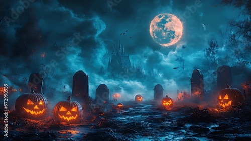13. A row of tombstones in a misty graveyard scene, surrounded by jack-o'-lanterns with glowing faces, eerie fog drifting across the ground, and a full moon overhead