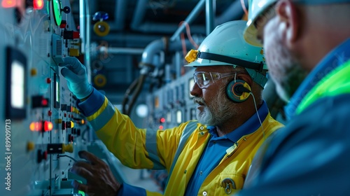 13. A senior engineer in a power plant, inspecting the control panel of a turbine. The engineer is wearing safety gear, including a hard hat and ear protection, and is accompanied by a technician