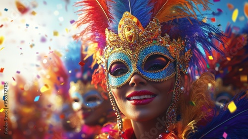 13. Carnival in Brazil, colorful background with samba dancers and masks, confetti and feathers scattered, vibrant and energetic, 3D illustration