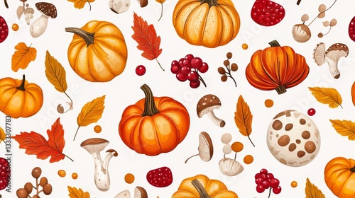 13.Simple Vector Pattern with Different Autumn Berries, Pumpkins, Mushrooms in Beautiful Fall Colors
