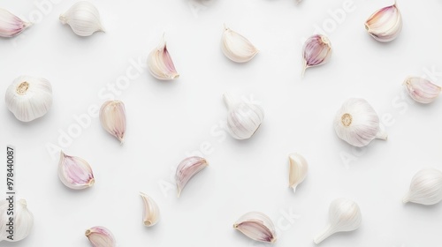 150. Top-down view of garlic cloves arranged on a white background, capturing the rustic and natural essence of the cloves in a minimalistic style