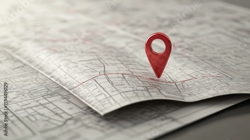 15.A clean and modern 3D vector design showcasing a folded map with a grid of roads and buildings. The map features a bold red location pin marking a destination point, with realistic shading and