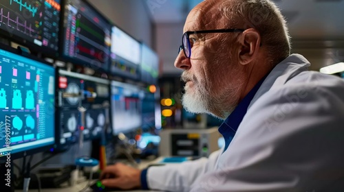 17. A senior engineer in a biomedical lab, analyzing data on a computer screen. The engineer is wearing a lab coat and glasses, surrounded by medical equipment and research papers. The lab is focused
