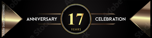 17 years anniversary celebration logo with gold number and metal triangle shapes on black background. Premium design for weddings, greetings card, happy birthday, poster, banner.