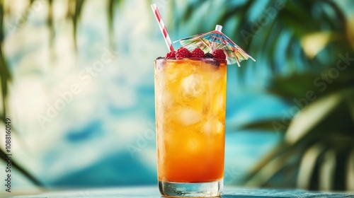 17.A vibrant cocktail in a tall glass, featuring a blend of citrus fruits like lemon and orange, accompanied by ice cubes and a garnish of fresh berries. The drink is decorated with a tropical straw