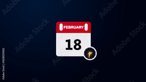 18 February Daily Calendar Icon. A simple modern flat design illustration of a tear off calendar page showing, clock 4k illustration round clock showing time Realistic calendar and clock .