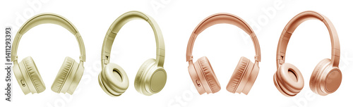 2 Set of pastel light orange yellow audio stereo headphones headset earpiece earphone Earbud, front side view on transparent cutout PNG. Mockup template for artwork