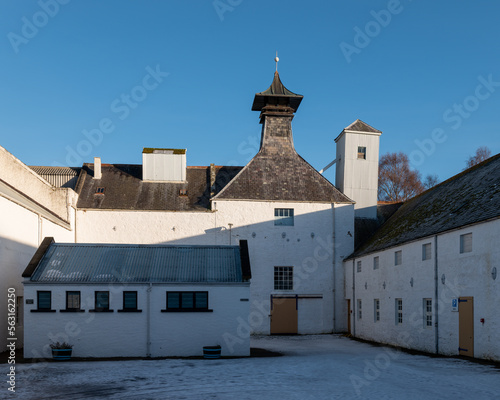 20 January 2023. Forres,Moray,Scotland. This is the Dallas Dhu Distillery near Forres following a snow fall on a bright sunny day with blue sky.