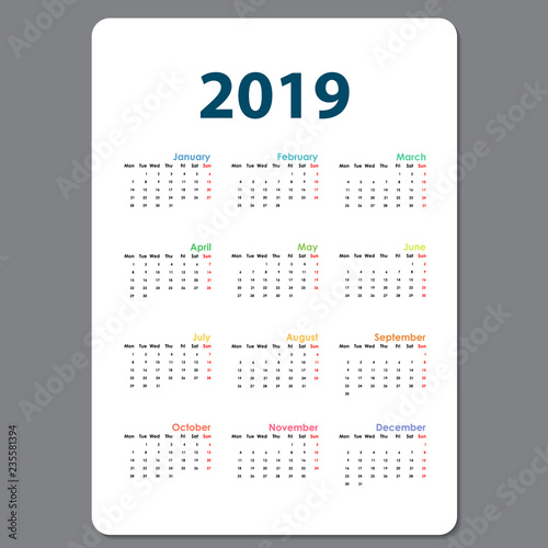 2019 Calendar Template.Calendar 2019 Set of 12 Months.Yearly calendar vector design stationery template.Vector illustration.
