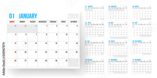 2020 calendar. calendar template on white background. Editable vector file available. English and sunday to monday version.Set of 12 Months. vector