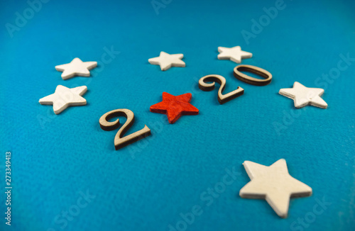 2020 number from wooden numbers on a blue background with scattered stars gears and flags around