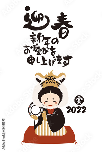 和風2022年の女の子の年賀状と手書きの筆文字のベクターイラスト素材