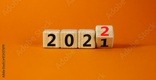 2022 happy new year symbol. Turned a cube, symbolize the change from 2021 to the new year 2022. Beautiful orange background. Copy space. Business and 2022 happy new year concept.
