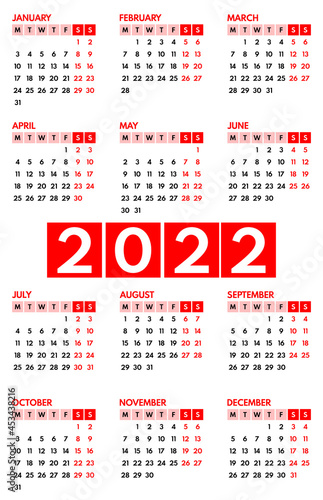 2022 pocket calendar, first day monday, two weekends, red color on white background, vertical layout, vector illustration