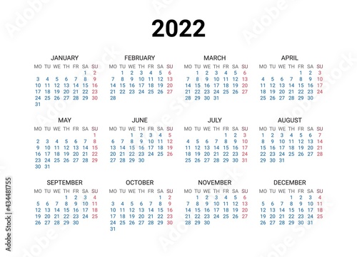 2022 year Englich calendar. Classical, minimalistic, simple design. White background. Vector Illustration. Week starts from Monday.