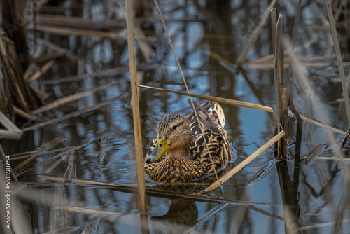 2022-11-30 A FEMALE MALLARD DUCK FRAMED BY REEDS IN THE LAKE IN MEDINA WASHINGTON