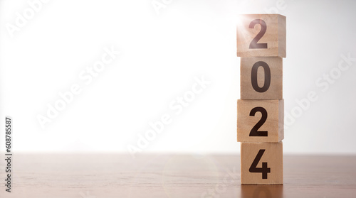 2024 Happy New year background for graphic. 2024 number on wooden cube blocks stack on white background with copy space. Welcome new year calender