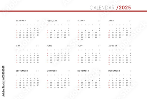 2025 Annual Calendar template. Vector layout of a wall or desk simple calendar with week start sunday.