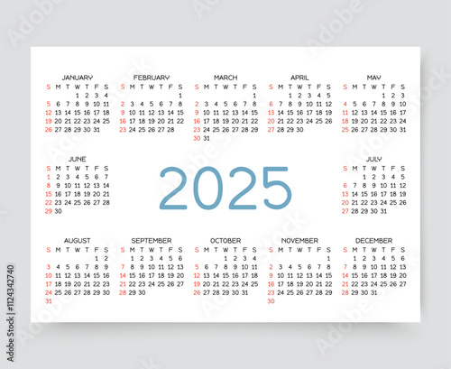 2025 calendar. Calender template. Week starts Sunday. Desk, pocket planner layout with 12 months. Horizontal format. Yearly organizer grid. Monthly diary in simple design, English. Vector illustration