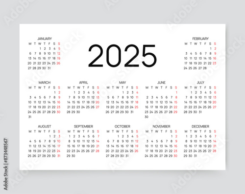 2025 year calendar. Calender layout. Week starts Monday. Monthly planner template with 12 months. Desk organizer grid in horizontal design, A4. Yearly stationery diary, English. Vector illustration